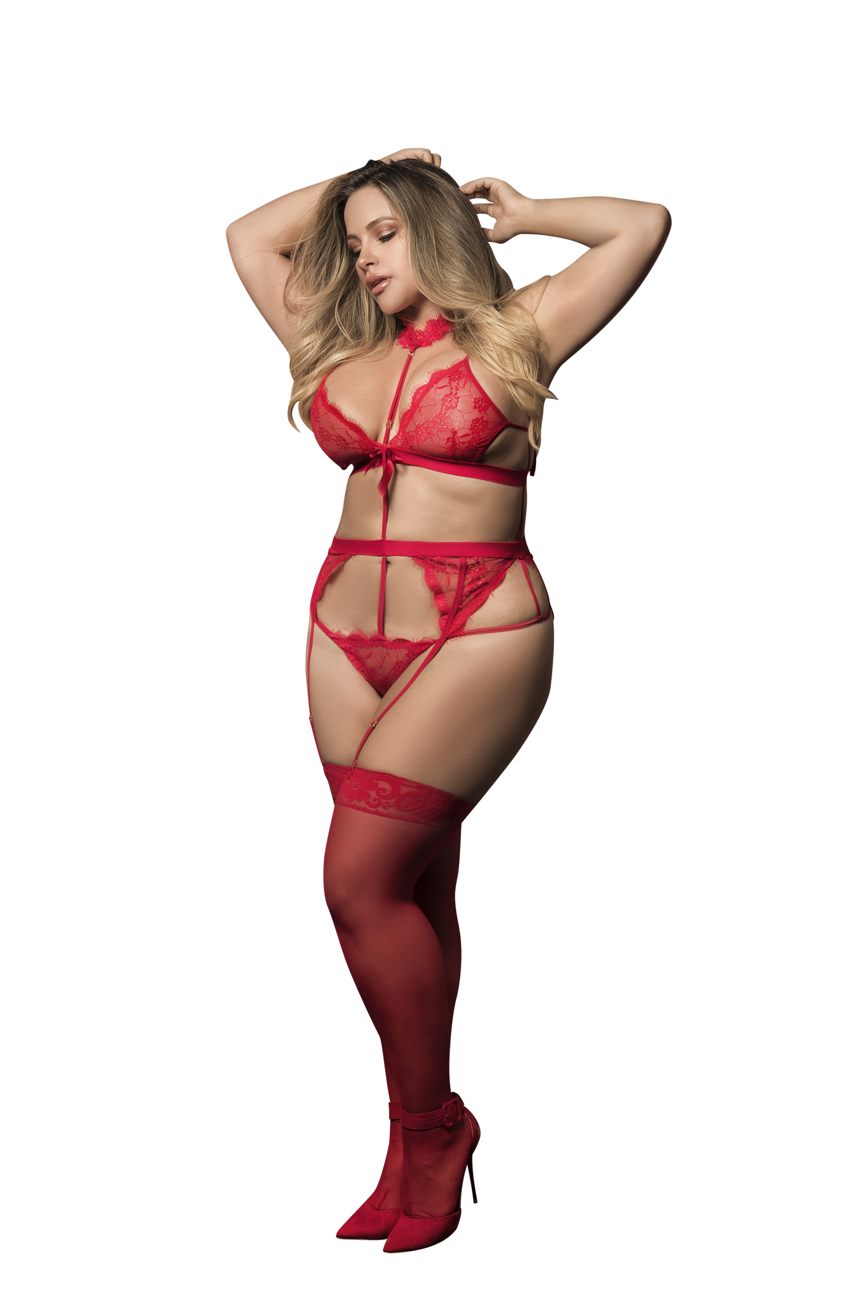 You’ll be eye candy wrapped in passionate red. Lace teddy made up of skimpy little pieces top, cincher with garters and thong all put together by an adjustable spaghetti strap that goes all the way up and finishes in the trendiest little lace choker. Wash Separately. Drip Dry. Do not Bleach