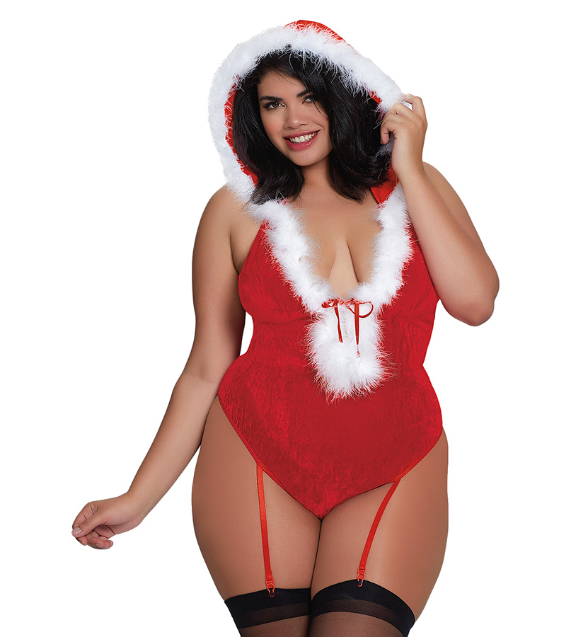 Heat up your holidays in this plus size Santa-themed stretch panne velvet teddy with marabou feather trims. Featuring a plunging neckline with adjustable ties and pom-pom details. Highlights include: halter neckline with attached hood and thong back. Comes with attached front garters and adjustable tie-back closures. Shown with Dreamgirl Style 0007X thigh highs (sold separately).
