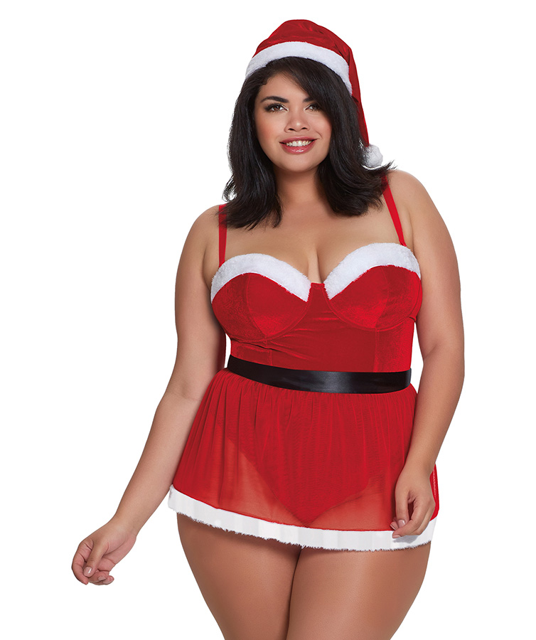 Heat up your holidays in this plus size 3-piece Santa-themed teddy set with tie-on ribbon closure. Set features a stretch velvet teddy and a matching mesh skirt and Santa hat. Teddy highlights include: underwire cups with a faux-fur trim and a thong back with snap closure. Matching mesh skirt with faux-fur trim which can be worn with the bow facing front or back. Matching velvet and faux-fur Santa hat. Comes with adjustable shoulder straps and a hook and eye back closure.